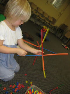 Ms. Michelle was here today for OT. We started with an academic obstacle course. The kids had to each select a colored ring, then transport that ring to the seal's neck across the room on a scooter board. Using their arms to move the scooter board, there was lots of creative ways to carry the ring, like on their backs or around their foot! Then the kids had to pick a colored animal, hop to the snowflake, and throw that animal to the matching colored paper. Lots of multi-step directions, so this was an activity that required lots of concentration to complete successfully! Finger fun was four stations of fine motor tasks. One group used tongs to move pom poms into an egg carton, one group matched pegs to colored pictures, one group put together straws using small connectors, and the last group used tiny pegs to make pictures. Everyone got a turn in each group....but there were some clear favorites that everyone liked best!!